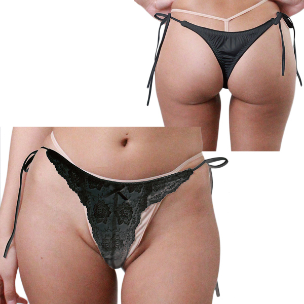 光沢生地にレース付き脇ヒモTバック Lサイズ ブラック