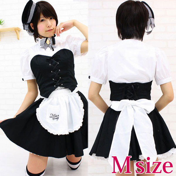 ■仕様:Mサイズ:B80〜87cm・W65〜70cm 丈:シャツ61cm(袖丈24cm)・ビスチェ30cm・スカート40cm・ペチコート36cm セット内容:シャツ(前ボタン、立て襟、襟繰りレース、胸部にビスチェ固定用のスナップ付)・ビスチェ(横ファスナー、内側にシャツ固定用のスナップ付)・エプロン・スカート・ペチコート(裾レース)・カチューシャ・帽子・ブローチ