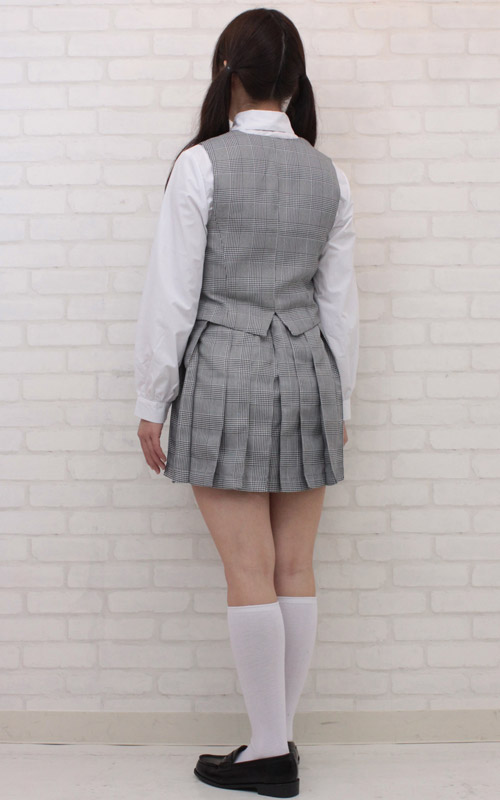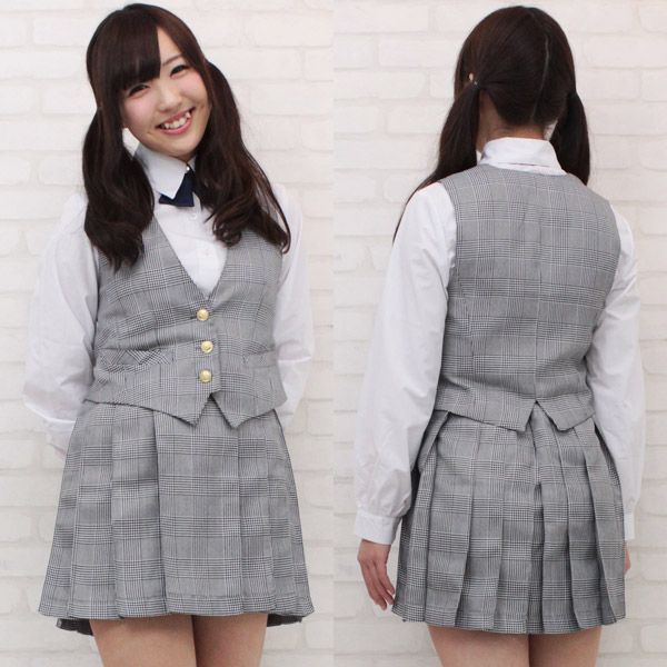 優等生気分が味わえる、金ボタン付きのベストがポイント!グレーのチェック柄が清楚なお嬢様風制服コスプレ(M)。