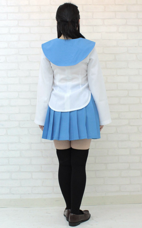 まるでアニメキャラ!襟とプリーツスカートを鮮やかな水色、ネクタイをオレンジ色に仕上げた可愛い長袖制服コスプレ(M)。