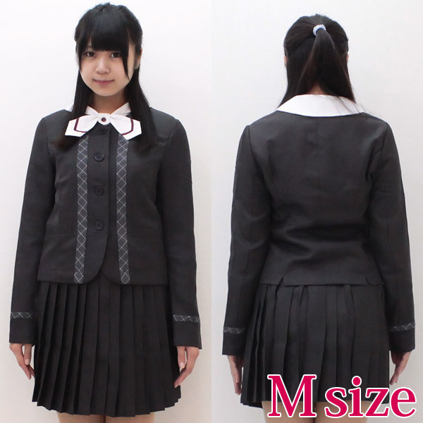 袖に縫いこまれたクラシックな刺繍がお洒落!チェックの部分使いが特徴的な濃紺ジャケット、エンジライン入りのリボンがお洒落な白シャツ、ミニ丈がセクシーなプリーツスカートが可愛い制服3点セットです。