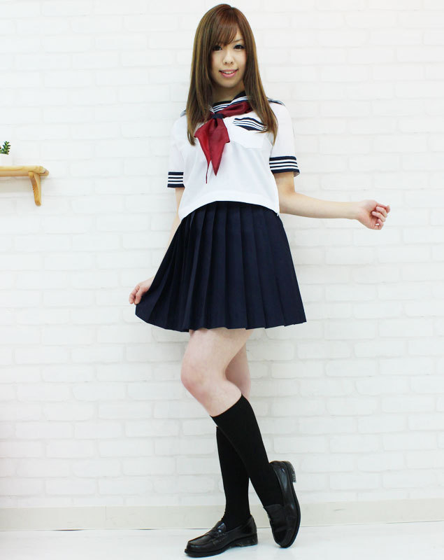 プリーツスカートは総ゴム入りでウエスト楽々!暑い夏も涼しく過ごせる白系トップスに、後ろ襟から少し覗かせたエンジの三角スカーフの3点セットは、可愛い女装にもぴったりな制服コスチュームです。
