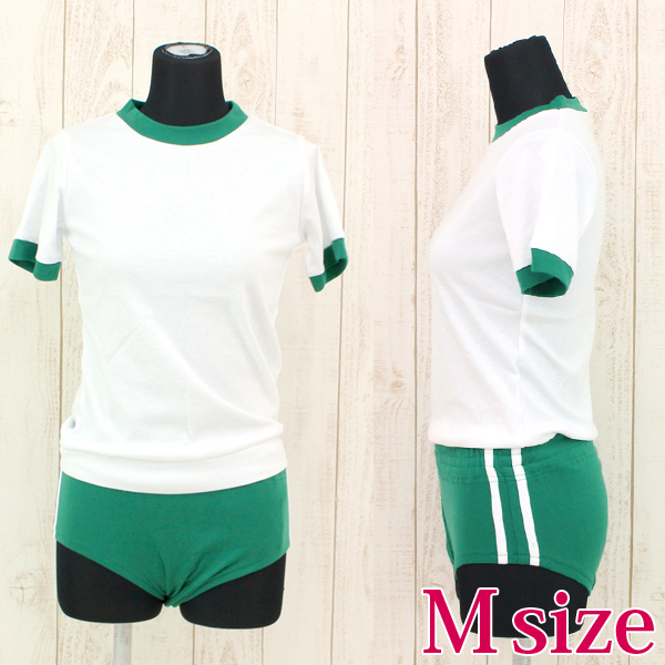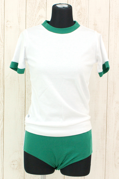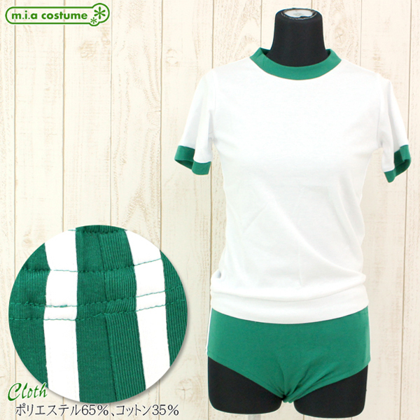 人気の体操服コスプレに新色グリーンの上下セットが登場しました♪白と緑の色使いは可愛く、すべすべとした生地は伸縮性があり着心地も抜群!緑のブルマはサイドに2本の白いライン入りでちょっぴり本格派♪洗濯時は手洗いも可能です。