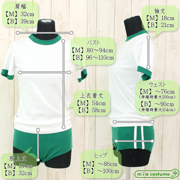 ■仕様:Mサイズ B80〜94cm・W〜76cm(伸縮時最大100cm)・H〜86cm 上衣:着丈54cm・肩幅32cm・袖丈18cm ブルマ:股上丈27cm セット内容:上衣、ブルマ 素材:ポリエステル65%、コットン35%