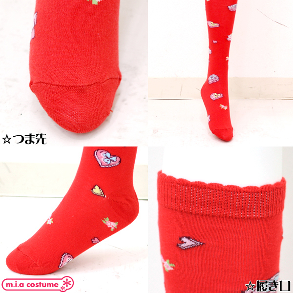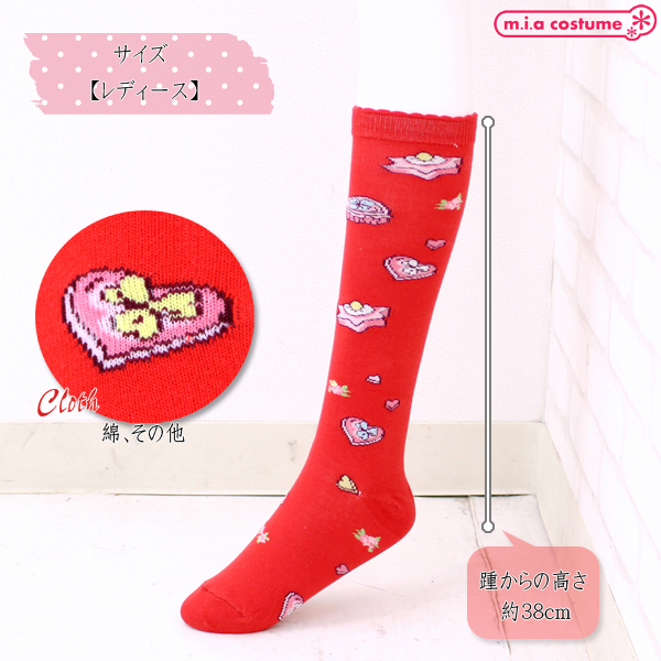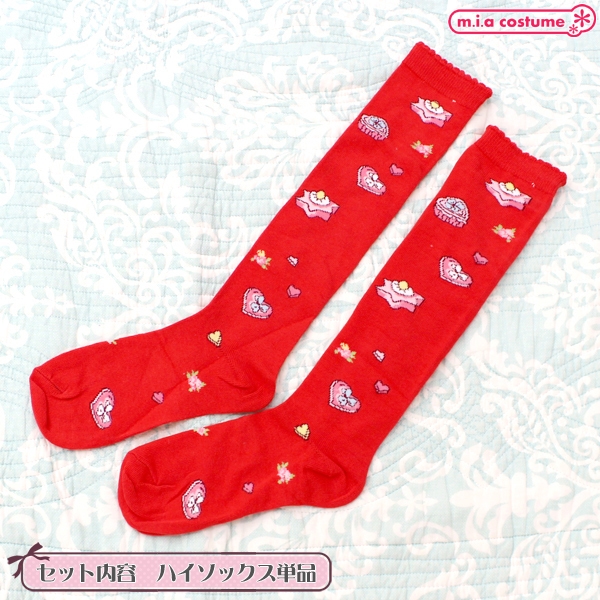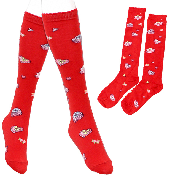 甘ロリコーデにプラスして可愛さアップ!縁が半円形のスカラップデザインになったキュートなお菓子柄のハイソックス(赤)。