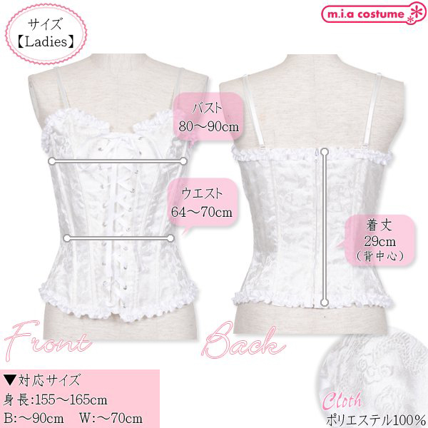 ■仕様:フリーサイズ:B80〜90cm・W64〜70cm・着丈29cm セット内容:コルセット単品(裏地なし、背面ファスナー) 素材:ポリエステル100% 対応サイズ:身長155〜165cm・B〜90cm・W〜70cm