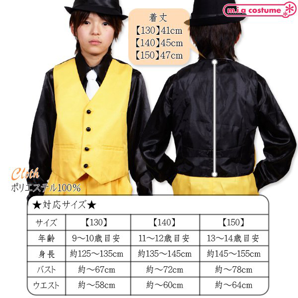 ■仕様:140サイズ 対応サイズ:身長135〜145cm・B〜72cm・W〜60cm 実寸:着丈45cm セット内容:ベスト単品(前ボタン) 素材:ポリエステル100%