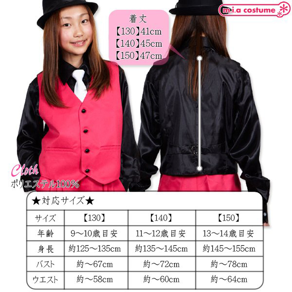 ■仕様:140サイズ 対応サイズ:身長135〜145cm・B〜72cm・W〜60cm 実寸:着丈45cm セット内容:ベスト単品(前ボタン) 素材:ポリエステル100%