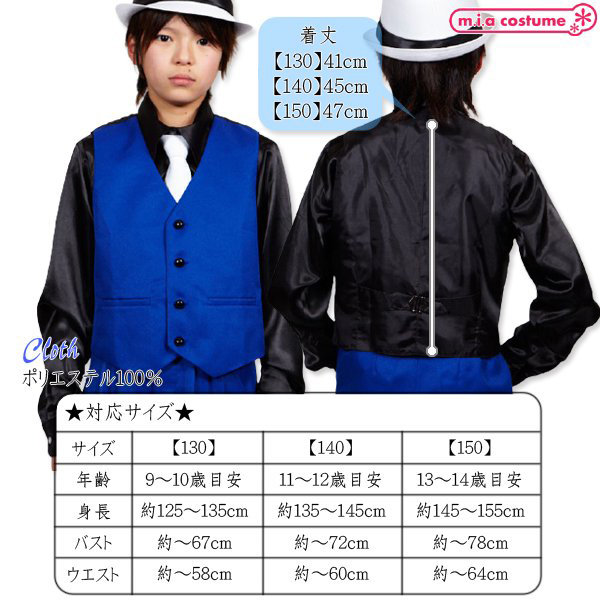 ■仕様:140サイズ 対応サイズ:身長135〜145cm・B〜72cm・W〜60cm 実寸:着丈45cm セット内容:ベスト単品(前ボタン) 素材:ポリエステル100%
