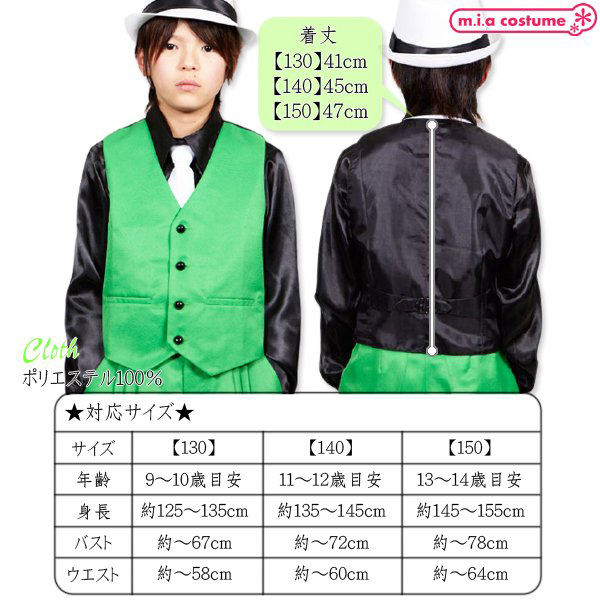 ■仕様:150サイズ 対応サイズ:身長145〜155cm・B〜78cm・W〜64cm 実寸:着丈47cm セット内容:ベスト単品(前ボタン) 素材:ポリエステル100%