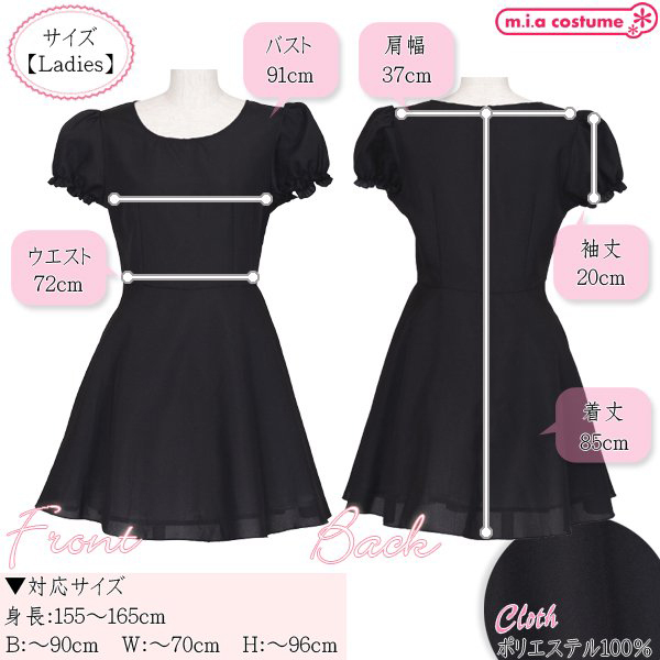 ■仕様:対応サイズ:身長155〜165cm・B〜90cm・W〜70cm・H〜96cm 実寸:B91cm・W72cm・肩幅37cm・袖丈20cm・着丈85cm セット内容:ワンピース単品(背中心ファスナー) 素材:ポリエステル100% モデル身長155cm