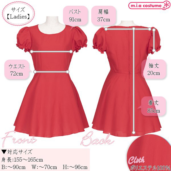 ■仕様:対応サイズ:身長155〜165cm・B〜90cm・W〜70cm・H〜96cm 実寸:B91cm・W72cm・肩幅37cm・袖丈20cm・着丈85cm セット内容:ワンピース単品(背中心ファスナー) 素材:ポリエステル100% モデル身長155cm