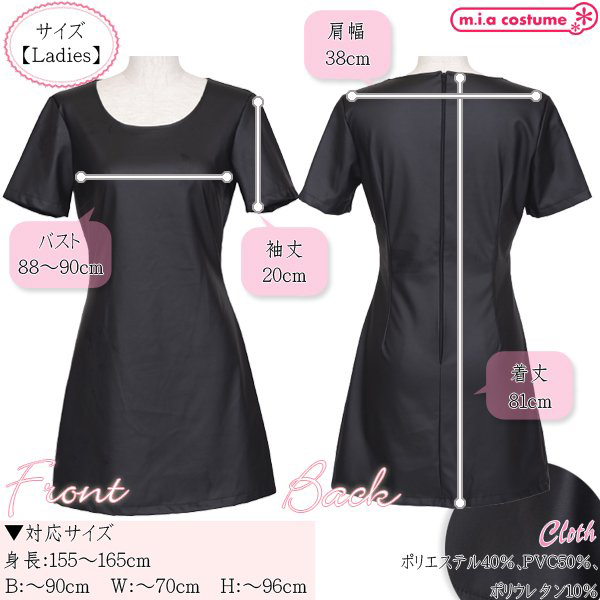 ■仕様:対応サイズ:身長155〜165cm・B〜90cm・W〜70cm・H〜96cm 実寸:B88〜90cm・肩幅38cm・袖丈20cm・着丈81cm セット内容:ワンピース単品(背中心ファスナー) 素材:ポリエステル40%、PVC50%、ポリウレタン10% モデル身長155cm