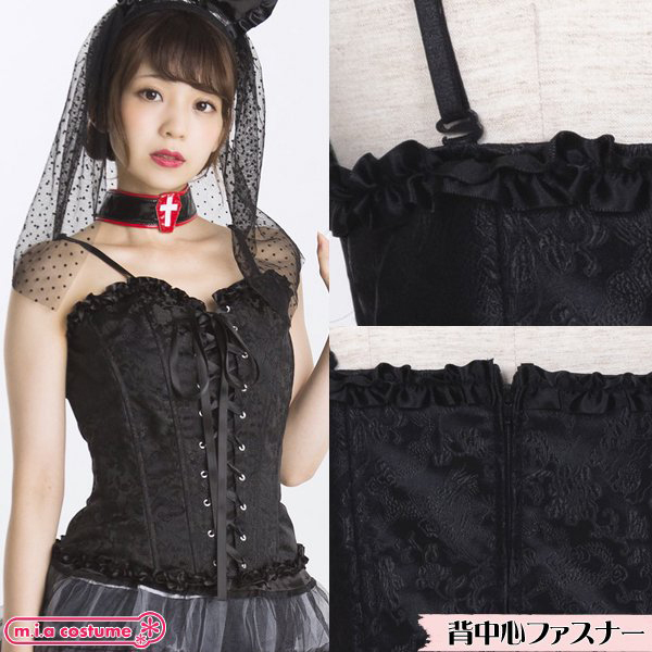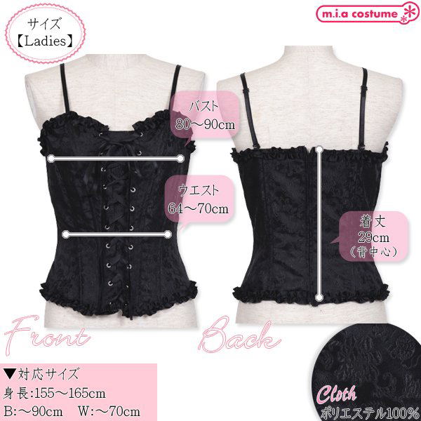 ■仕様:対応サイズ:身長155〜165cm・B〜90cm・W〜70cm・H〜96cm 実寸:B80〜90cm・W64〜70cm・着丈29cm(背中心) セット内容:コルセット単品(背中心ファスナー) 素材:ポリエステル100% モデル身長155cm