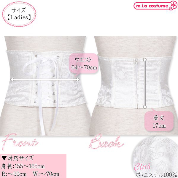 ■仕様:対応サイズ:身長155〜165cm・B〜90cm・W〜70cm 実寸:W64〜70cm・着丈17cm セット内容:コルセット単品(背中心ファスナー) 素材:ポリエステル100% モデル身長155cm