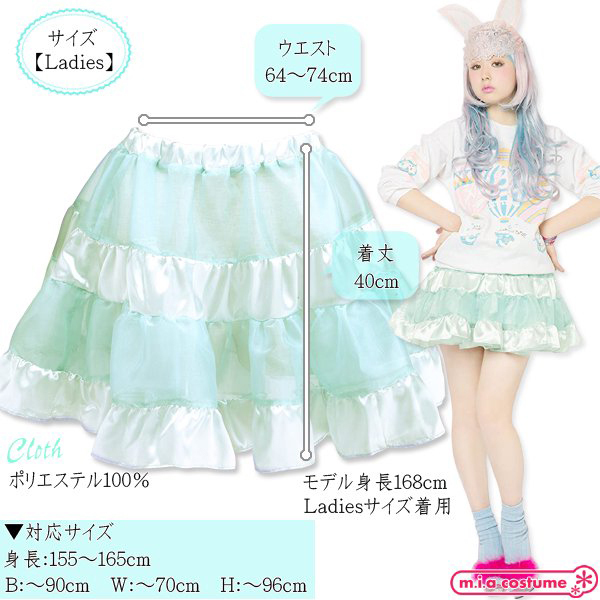 イベント用衣装やパーティーコスプレとしても良さげ♪原宿系カリスマモデル「AMO」がプロデュースする新ブランド「LUNATICLEMONYLOLLIPOP」からティアードスカート(ベビーブルー)が登場!サテンの光沢感とシースルー素材の組み合わせが可愛くて、重ねるボトムスで様々なコーディネイトが楽しめる逸品です。